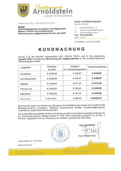 Kundmachung Abrechnung Jagdpachtzins 2025 – Gemeindejagdgebiete